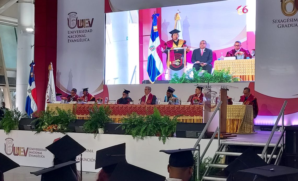 Santo Domingo. D.N. La Universidad Nacional Evangélica (UNEV), nueva vez cumplió con su rol más importante, dar a luz nuevos profesionales para la construcción de una mejor sociedad, al titular a 656 graduandos de grado y postgrado, en diversas licenciaturas y maestrías, de los cuales, 38 recibieron medallas al graduarse con honores.